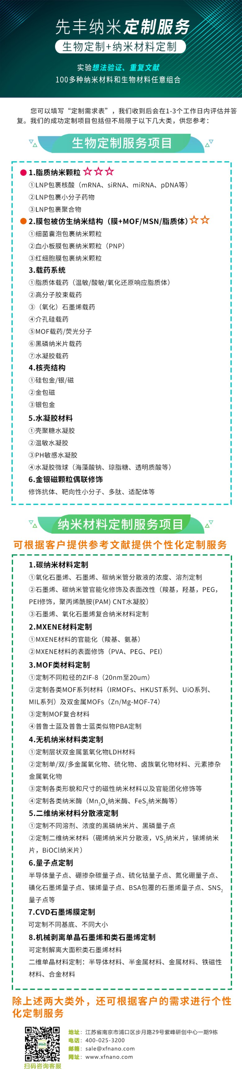 近年来,纳米技术在生物医药的应用越来越广泛,引起了广大研究人员的关注。纳米生物复合材料在纳米载体、纳米药物及纳米生物组织工程等方面得到了越来越多的研究和应用。为了响应广大研究人员的强烈要求,先丰纳米2024年定制服务项目增加了脂质纳米颗粒载体结构、膜包被仿生纳米结构、载药系统等纳米生物复合材料的服务