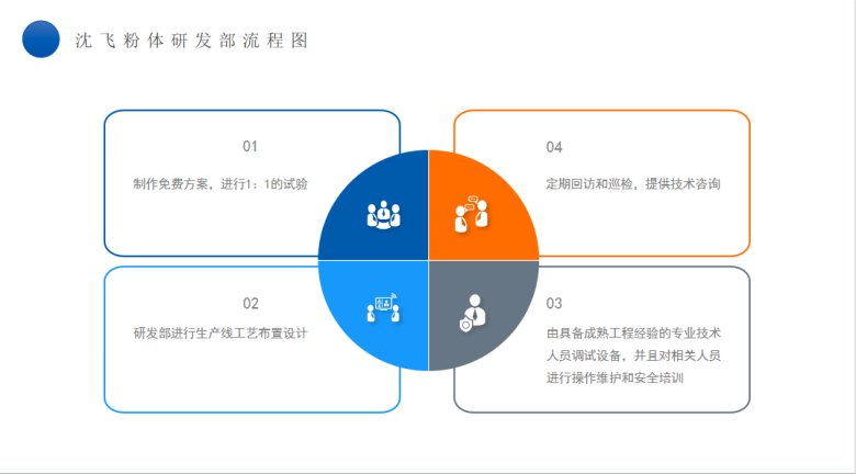 研发部简介沈飞的产品设备是由资深工程研发团队设计开发,为确保产品品质,从产品设计到制造,我司实行一条龙服务,且公司拥有配套的试验设备。沈飞粉体研发部始建于1985年,至今已成立37年,是国内第一批成立的气流粉碎机部门之一,也是优秀的人才集聚地。研发部现有职工27人,其中设计人员21人,试验人员6人,