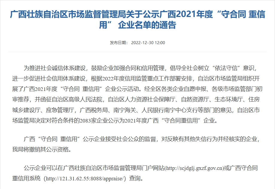 近日,广西壮族自治区市场监督管理局发布了《关于公示广西2021年度“守合同 重信用”企业名单的通告》,桂林矿山机械有限公司凭借良好的市场信誉和优质服务等综合实力,荣获广西2021年度“守合同 重信用”企业称号,充分展现了公司诚信经营的良好社会形象!“守合同 重信用”活动是市场监管部门对企业信用的一种