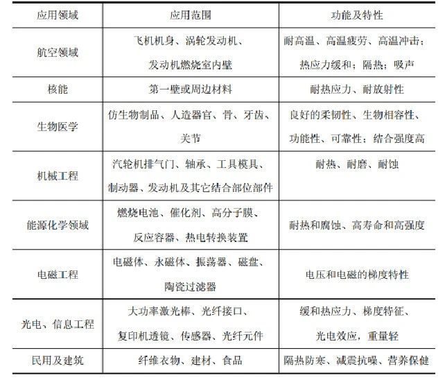 功能梯度材料应用前景广泛功能梯度材料(FGM)具有空间渐变的组分、孔隙或微结构等特点,是一种先进的非均质复合工程材料。与常规的复合材料相比,功能梯度材料宏观上性能在同一方向上呈连续梯度变化。这使其具有良好的绝缘性能、轻量化、耐腐蚀性能优异、易加工成形等优点,因此在航空航天、建筑工程、交通工程、生物医