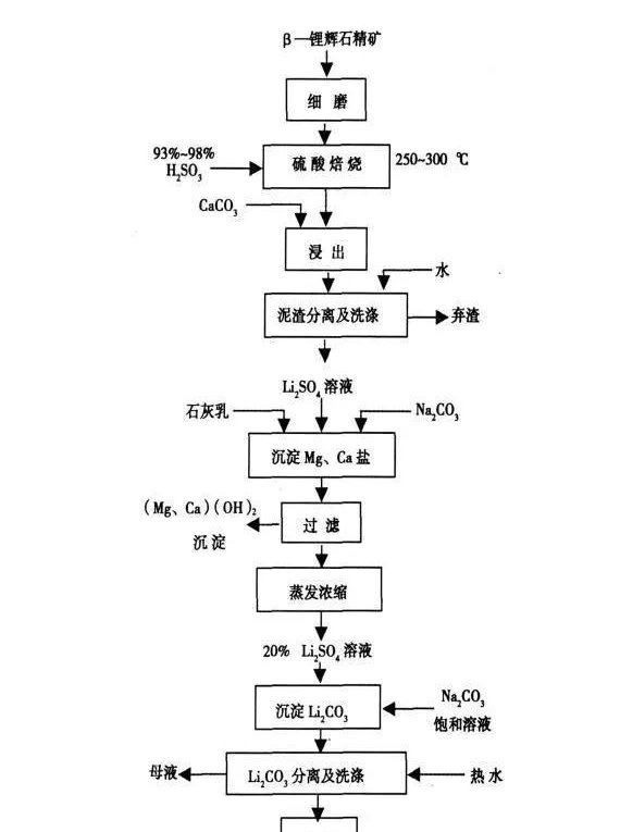 碳酸锂是锂电池的原料,提取自锂辉石、锂云母等固体锂矿石。随着新能源产业和锂电池技术的发展,锂的需求量日益增大,广泛应用于新能源汽车等领域。 碳酸锂生产工艺流程指的就是从锂辉石、锂云母等锂矿物中提取锂资源的过程,主要生产工艺有石灰烧结法和硫酸法,其中硫酸法是目前使用的主要方法。 锂辉石提锂——硫酸法: