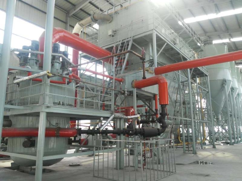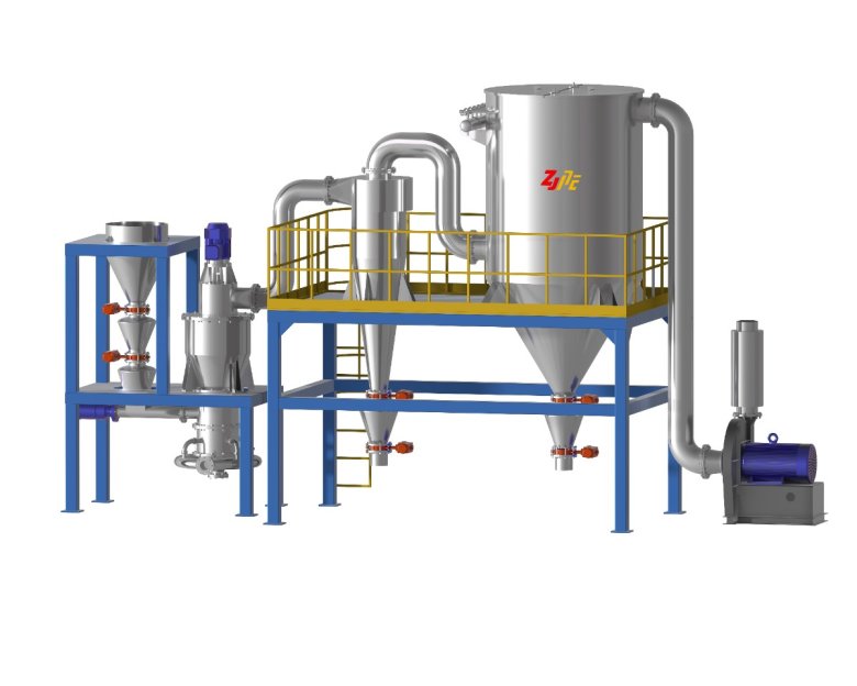 蒸汽动能磨是利用过热蒸汽经过同轴心喷嘴将颗粒加速、并进行碰撞粉碎,粉碎后的物料经过分级机分级,合格粉料进入后面的收集系统收集,不合格物料返回粉碎机继续被粉碎。整个系统蒸汽保持在过热状态,生产在全干法下进行。可以利用过于蒸汽作为气源,节约成本,同时提高超强动力,其粉碎强度扩大到1000m/s,可粉碎到