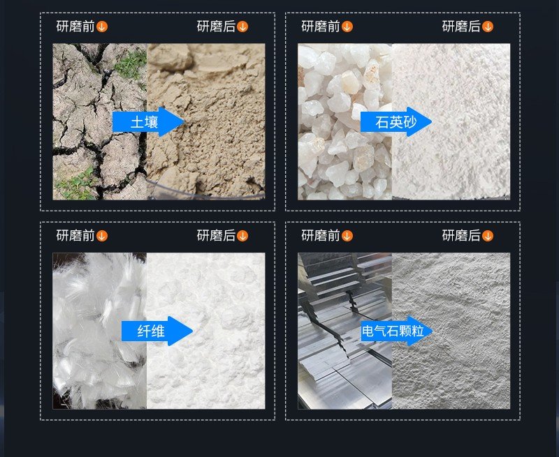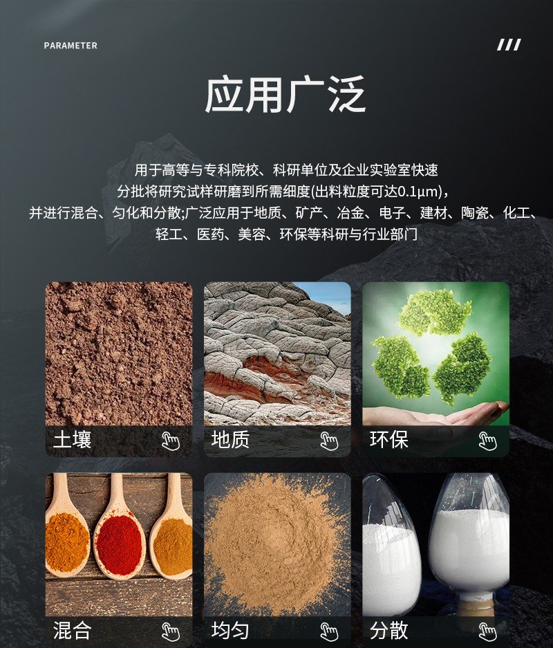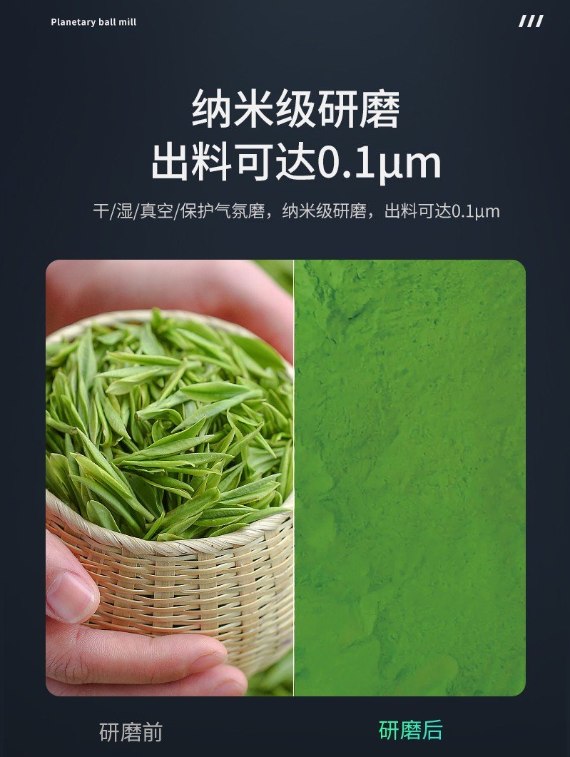 采用行星式高能研磨技术,出料细度可达纳米级(<0.1μm),支持金属、陶瓷、锂电原材料等硬脆材料的精细研磨,等各类原材料等硬脆材料的精细研磨,可实现干法/湿法研磨。