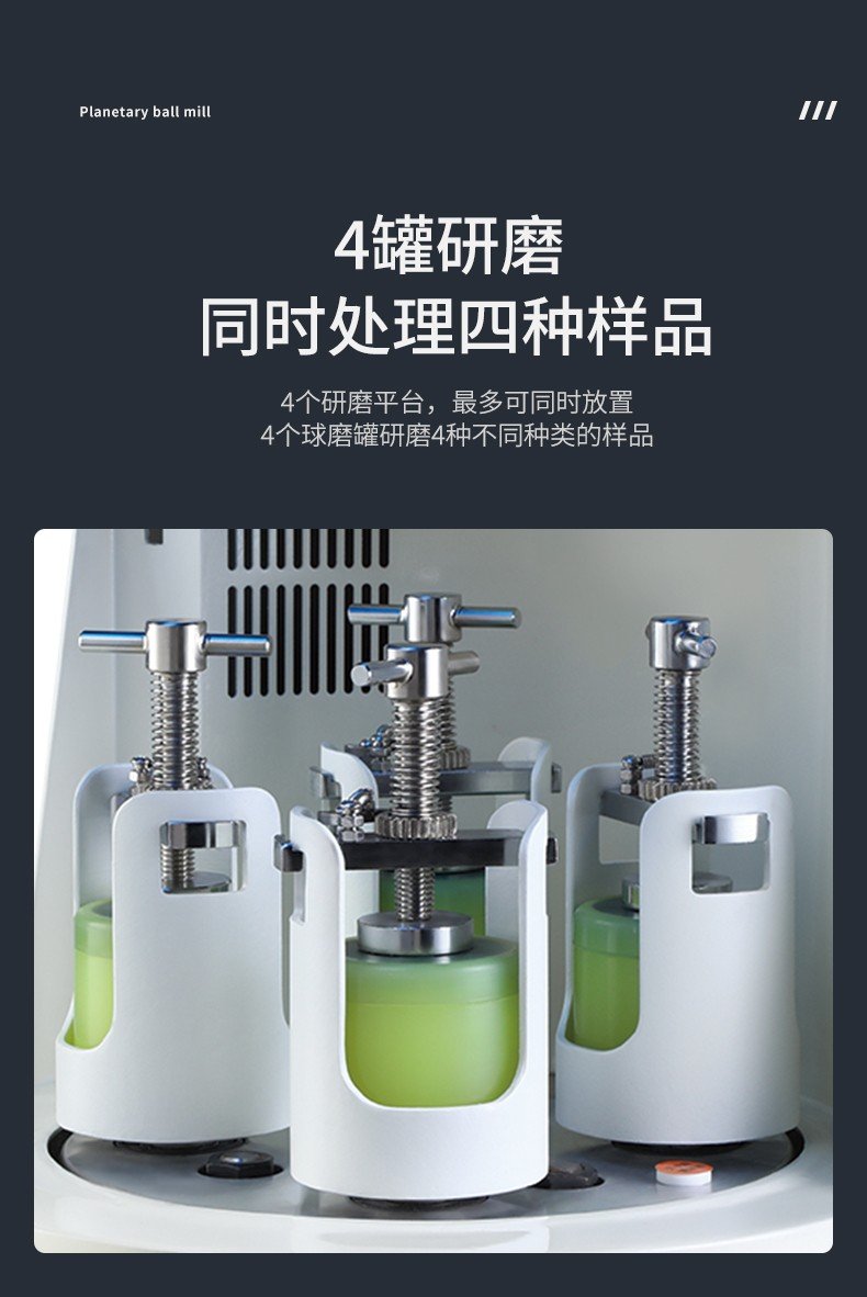 ●  *多可同时放置4个球磨罐研磨4种不同种类的样品,也可对称放置2个球磨罐使用;