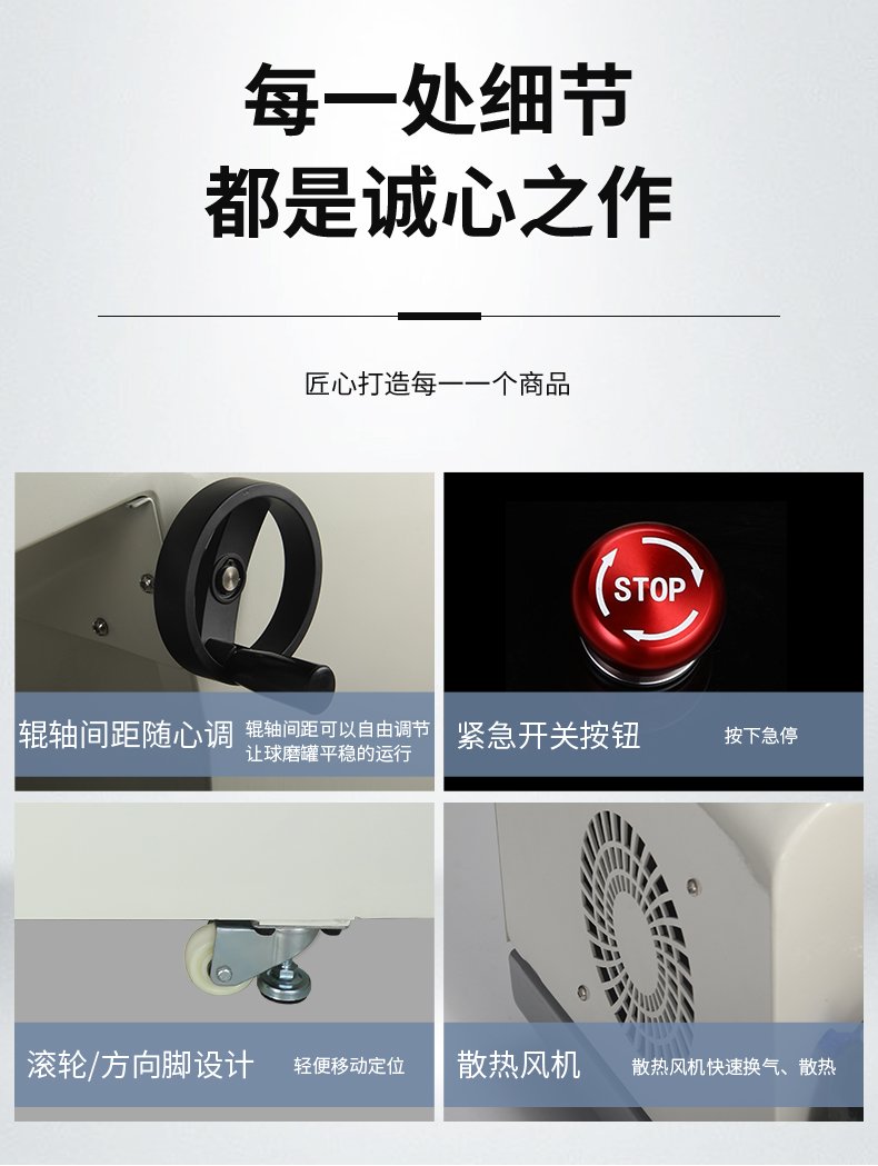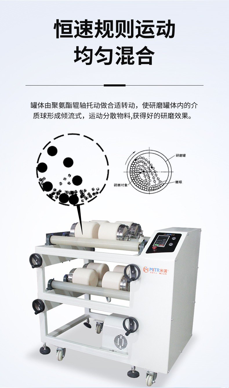 罐磨机工作原理是跟着两根滚轴来运动,所产生的研磨球的规则运动,内部的运动均匀,不会出现粘壁,沉淀等现象。**的优势不是超细研磨,而是干粉混合,浆料混合,纳米混合,在所有的机型中,滚筒球磨机的混合效果远远高于其他球磨设备,在实验数据分析报表里它呈现的粉体曲线较窄,峰值较高,那么材料在下一个工艺中可发挥出更高的稳定性。