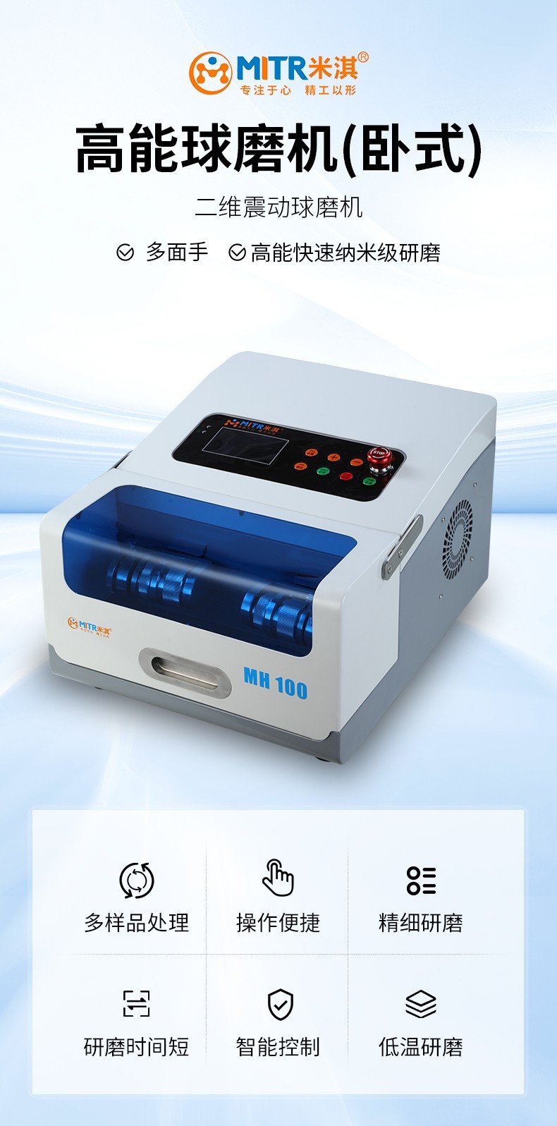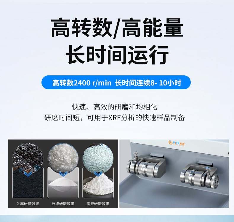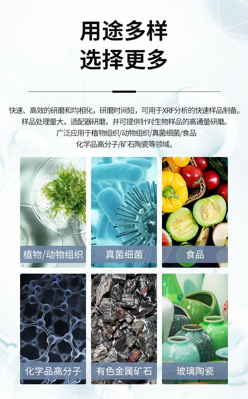MM100 球磨仪可粉碎和研磨包括纤维组织、骨头、头发、化学品、药品、矿物、矿石、合金、玻璃、陶瓷、土壤、污泥、谷物颗粒、塑料、纺织品在内的诸多材料。对于大部分材料,其只需要几十秒种的时间就可以达到对样品研磨、混合、均相化的目的。