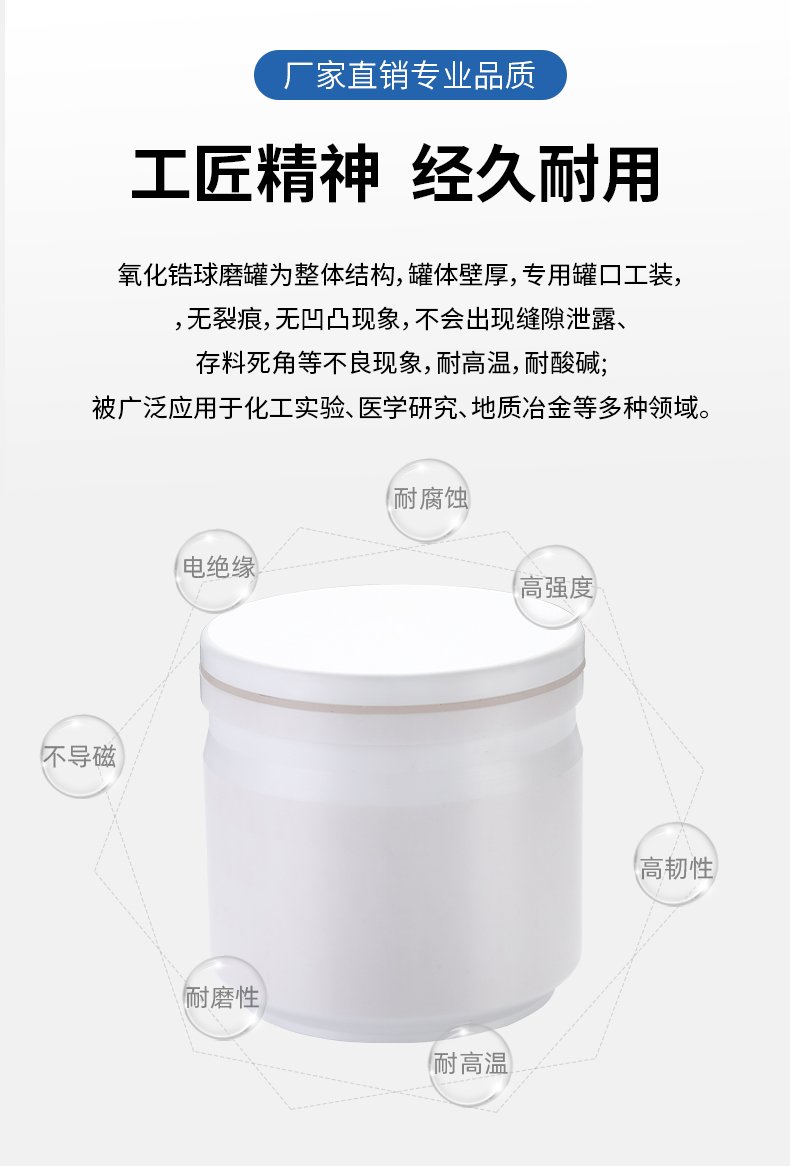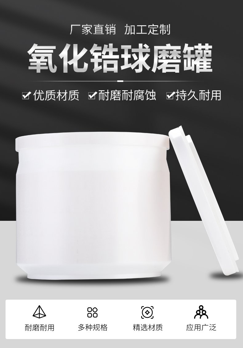 氧化锆球磨罐具有耐磨性好,强度高,磨耗小等优点。用于稀土材料的研磨测,能限度的保证被研磨的原料不会掺入其它杂质。球磨机一般配套氧化锆球罐,磨球研磨物料使用。
