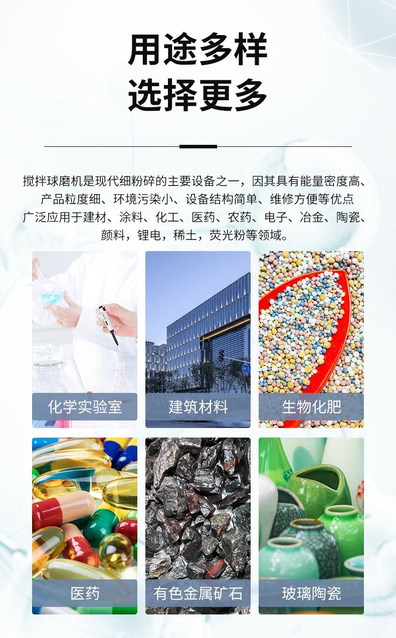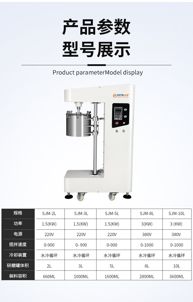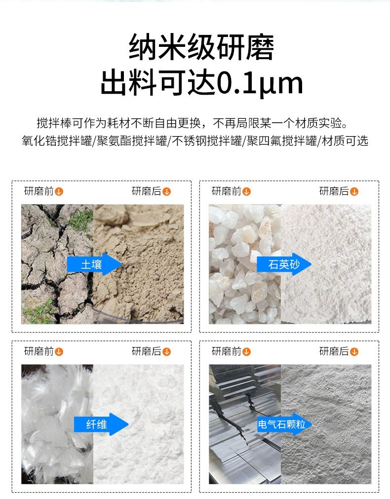 桶体固定不动,搅拌器发挥强有力的作用,故可在不停机的情况下进行抽样检验和添加磨料。可以使用两种或多种不同的物质在彼此之中互相分散,从而达到均匀混合,也可以加速传热和传质;实现高能水冷循环、无污染、分散均质化、研磨混合。