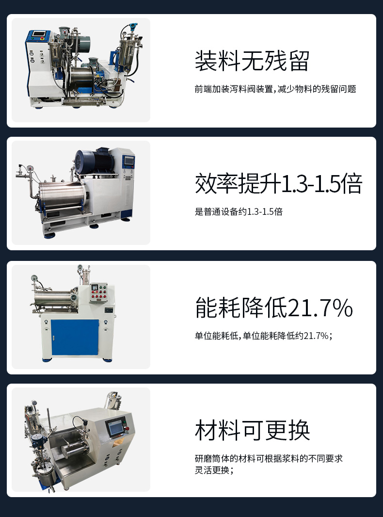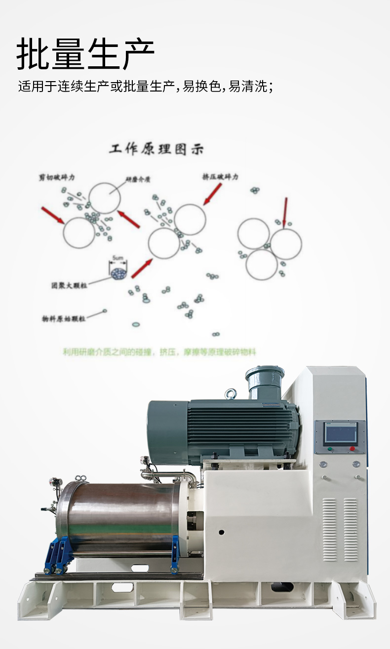 升级版棒销研磨结构,动力更强,转速高,运行稳定可靠。 动态筛网系统,流量大不堵塞。加强了研磨介质对物料的撞击和剪切作用,散热性能好。适用于分散难度高的物料研磨及微米级物料的高效率研磨。