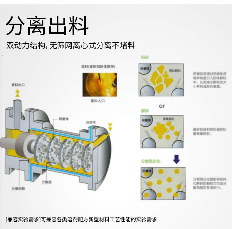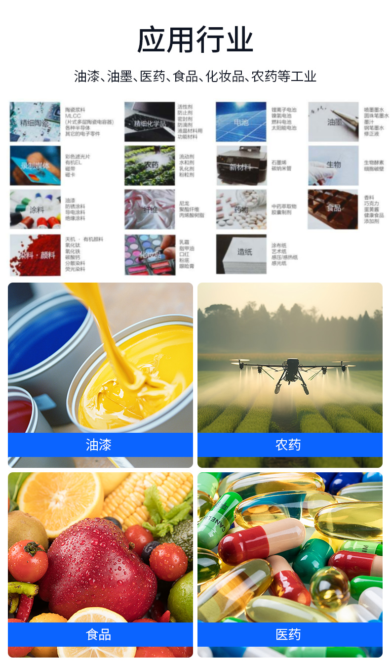适用于锂电材料(磷酸铁锂、硅碳负极等)、硅微粉、氧化锆、氧化铝、硅酸锆、电子陶瓷、农药悬浮剂、磁性材料、墨水涂料、医药食品、生物化工及其他纳米级材料领域。