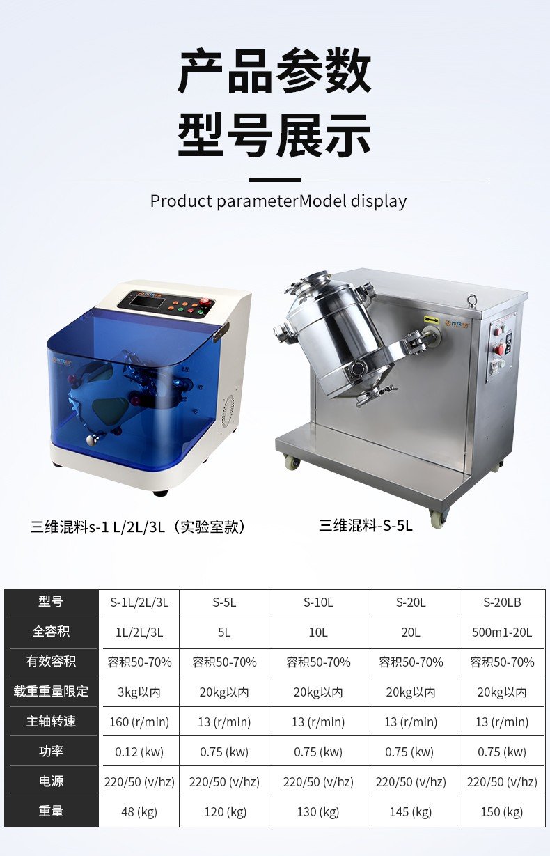 三维运动混合机广泛应用于制药、化工、食品、轻工、电子、机械、矿冶、国防工业以及各种科研单位的粉状、颗粒状物料的高效混合。三维混合机是通过混合筒空间上的三维运动,来消除物料因离心力作用产生的比重偏析,分层,积聚现象,实现多种物料之间相互流动,扩散,从而达到快速、均匀地混合物料。目前各类混合设备中,三维混合机是各方面性能较理想的先讲产品。