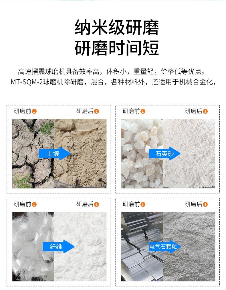 MT-SQM-2球磨机除研磨,混合,各种材料外,还适用于机械合金化,几种金属或者非金属的粉末或颗粒,在高能球磨过程中反复混合,破碎和冷焊,在球磨中逐渐细化,并在固态下形成合金相的核,使过去传统熔炼工艺难以实现的某些物质在球磨过程中实现合金化.