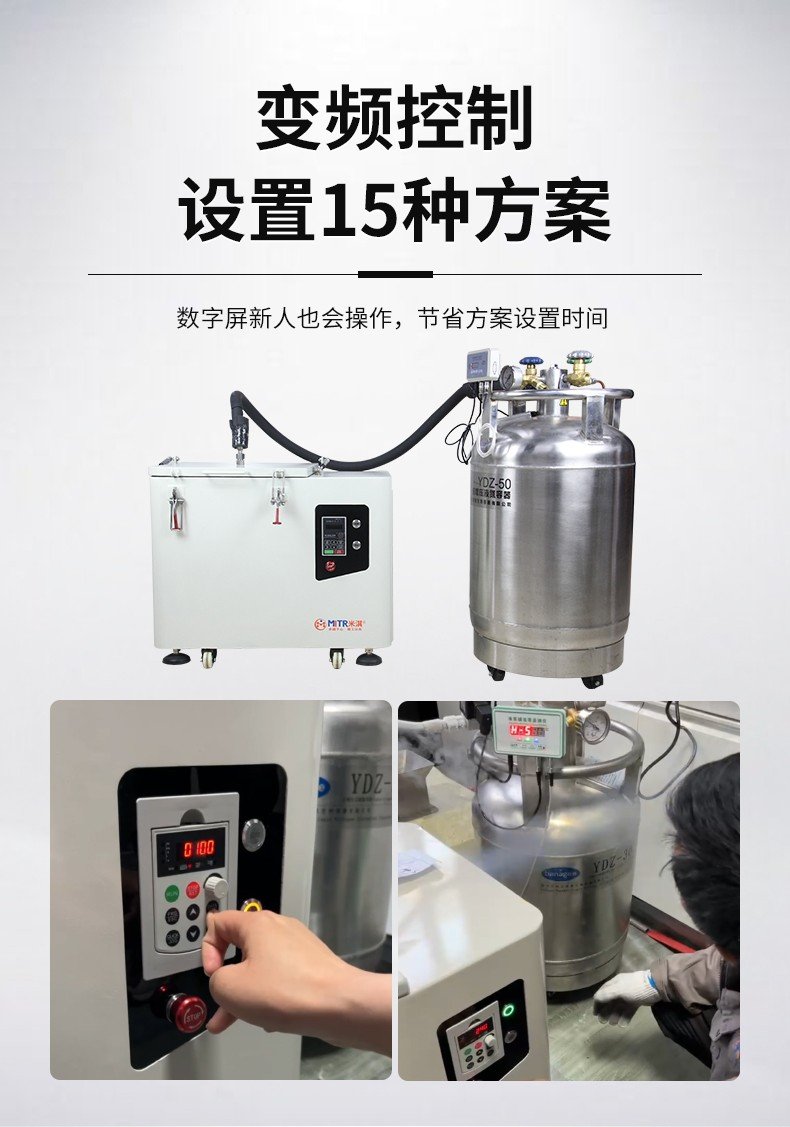 3)球磨机工作温度可达-60℃-20℃,通过液体氮气进行转化为气体输送到球磨机的腔体内,对正在做行星运作的球磨罐产生的高温进行冷却,从而降低罐子内温度,致使物料不被高温破坏内部的元素.