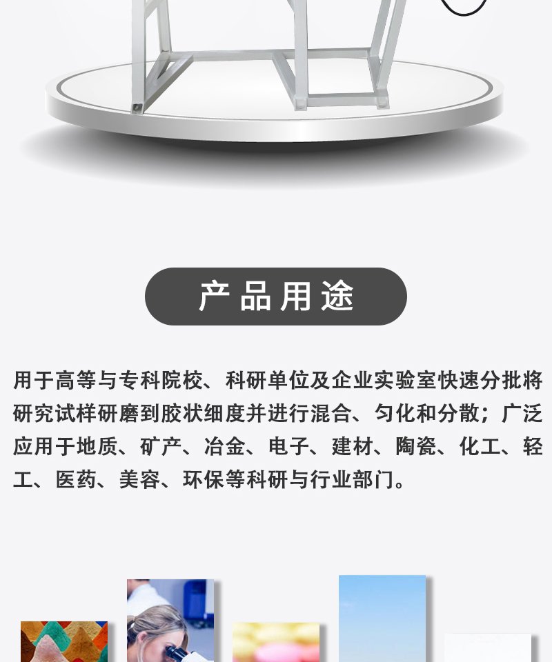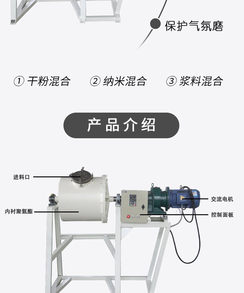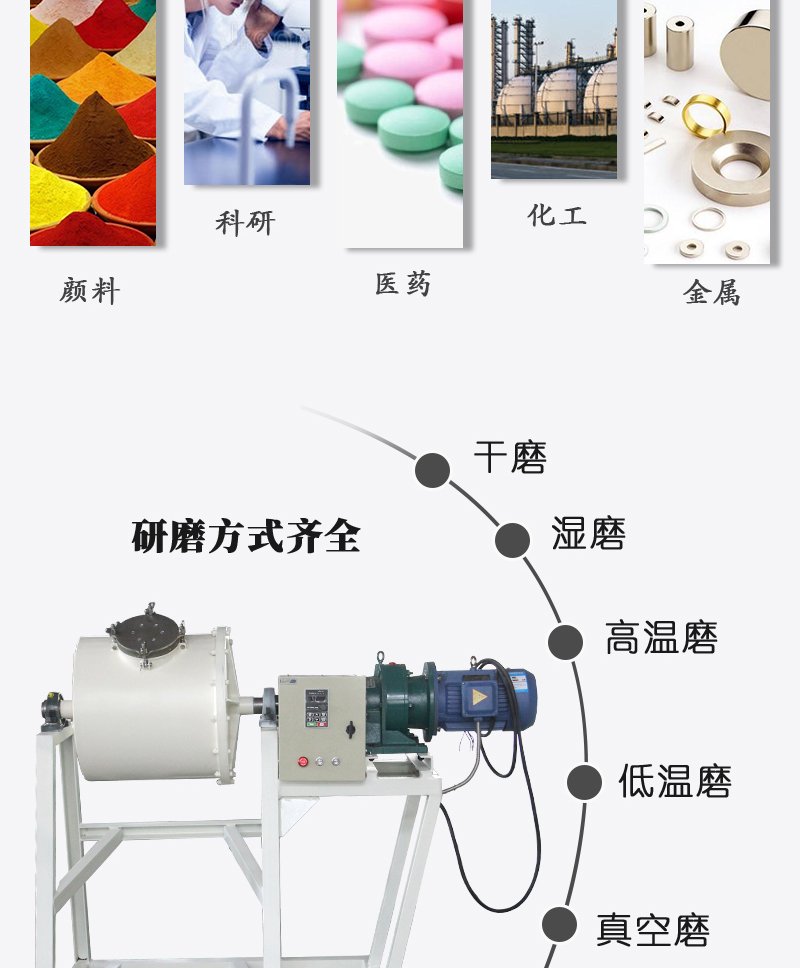 它广泛应用于水泥,硅酸盐制品,新型建筑材料、耐火材料、材料化学实验室,生物化肥与有色金属选矿以及玻璃陶瓷等生产行业,对各种矿石和其它可磨性物料进行干式或湿式混合。广泛应用于电子、陶瓷、涂料、玻璃粉、荧光材料、非金属矿、医药、电子材料、磁性材料、装备电池、生物培育、食品包装、电池材料等进行加工的过程中研磨和混合。