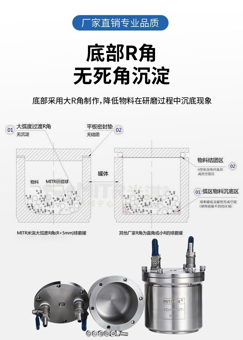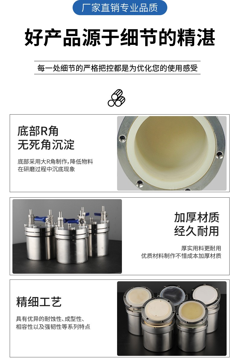 在行星球磨机和滚筒球磨机的实验当中,常规的研磨都是通过用行星球磨罐的形式来做实验研磨,此类的研磨罐可干磨也可湿磨,但是在研磨过程中无法杜绝空气进入罐体,无法保证在研磨过程中粉体与空气产生反应,因此真空罐则应用在了气氛保护研磨中的实验,长沙米淇科技生产的真空气氛保护球磨罐不单纯是在隔绝空气这单一的实验,更可在做隔绝氧气的同时又可避免了样品受不锈钢罐体的磨损污染,在真空气氛保护球磨罐内可根据不同的实验内衬多种不同的材质,如内衬刚玉,氧化锆,尼龙,聚四氟,聚氨酯,玛瑙,硬质合金,碳化硅等等.长沙米淇生产的真空气氛保护球磨罐采用内衬罐与真空罐套高密封结合,区别与市场上的大罐套小罐制作.