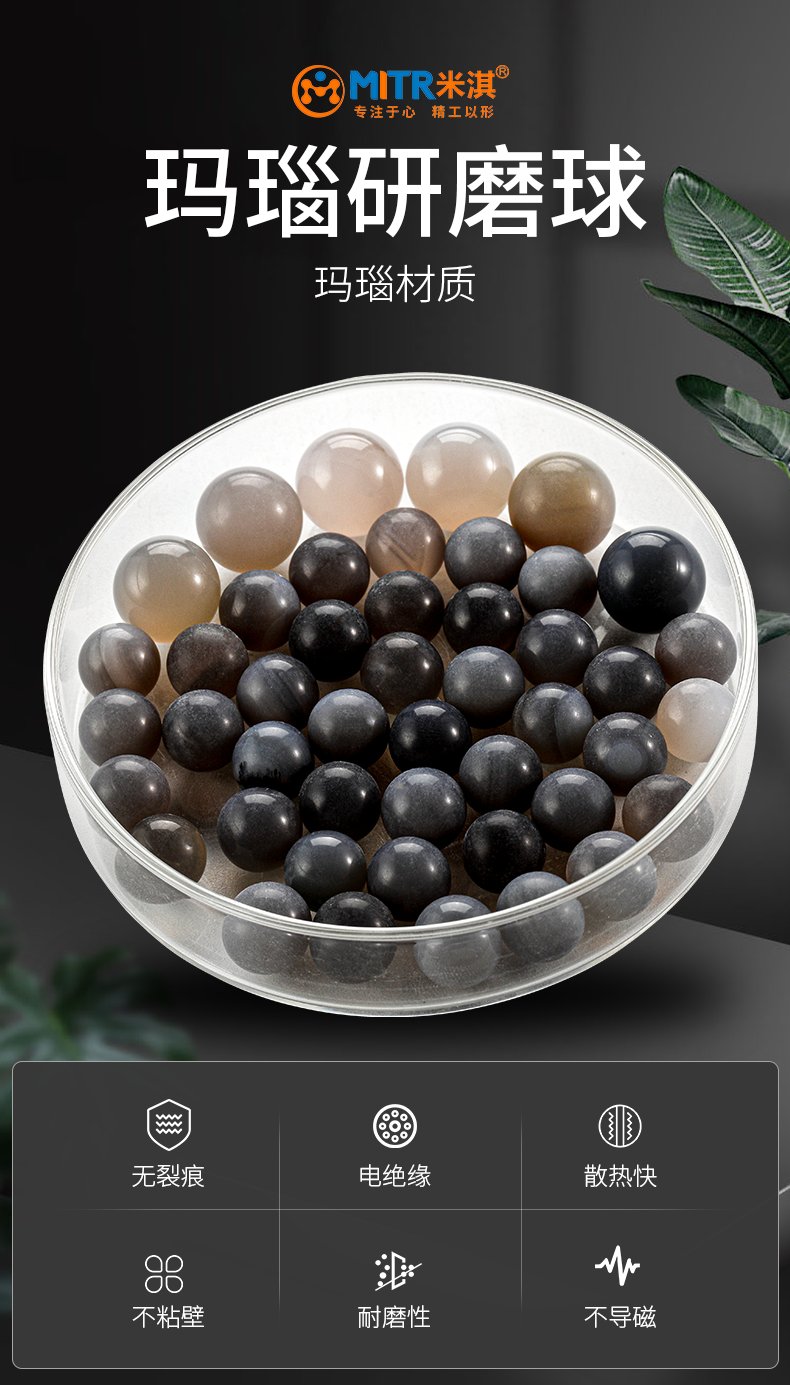 研磨介质是球磨机内滚动的球或圆柱物体。MITR米淇研磨球是指配套用于实验室球磨机仪器上,装在球磨罐里使用的研磨球,它的材质有不锈钢、玛瑙球、氧化锆球、尼龙球和聚四氟球等多种材料和规格大小的球体,根据研磨的物料对象特点,提供多种研磨球解决方案。