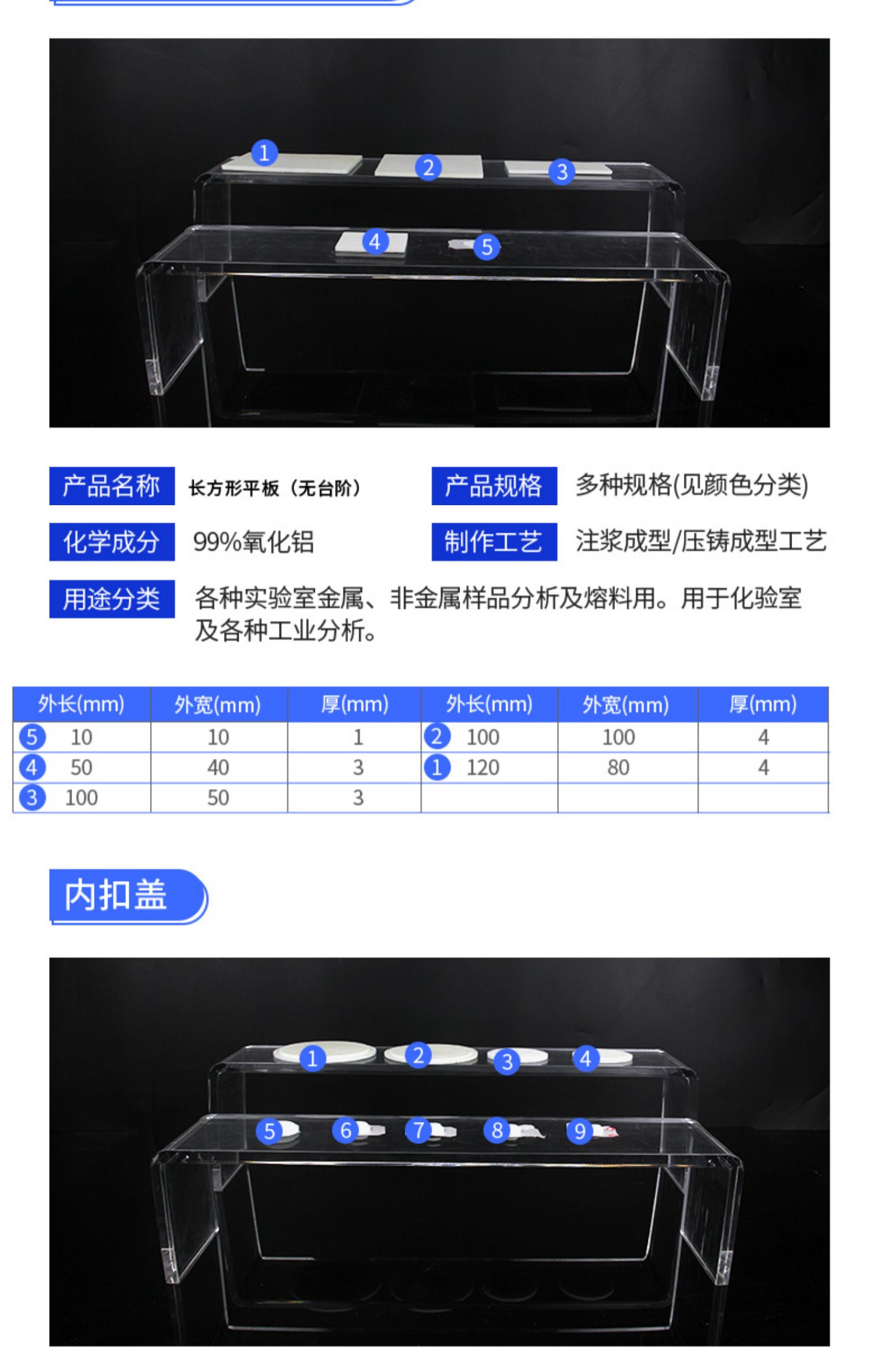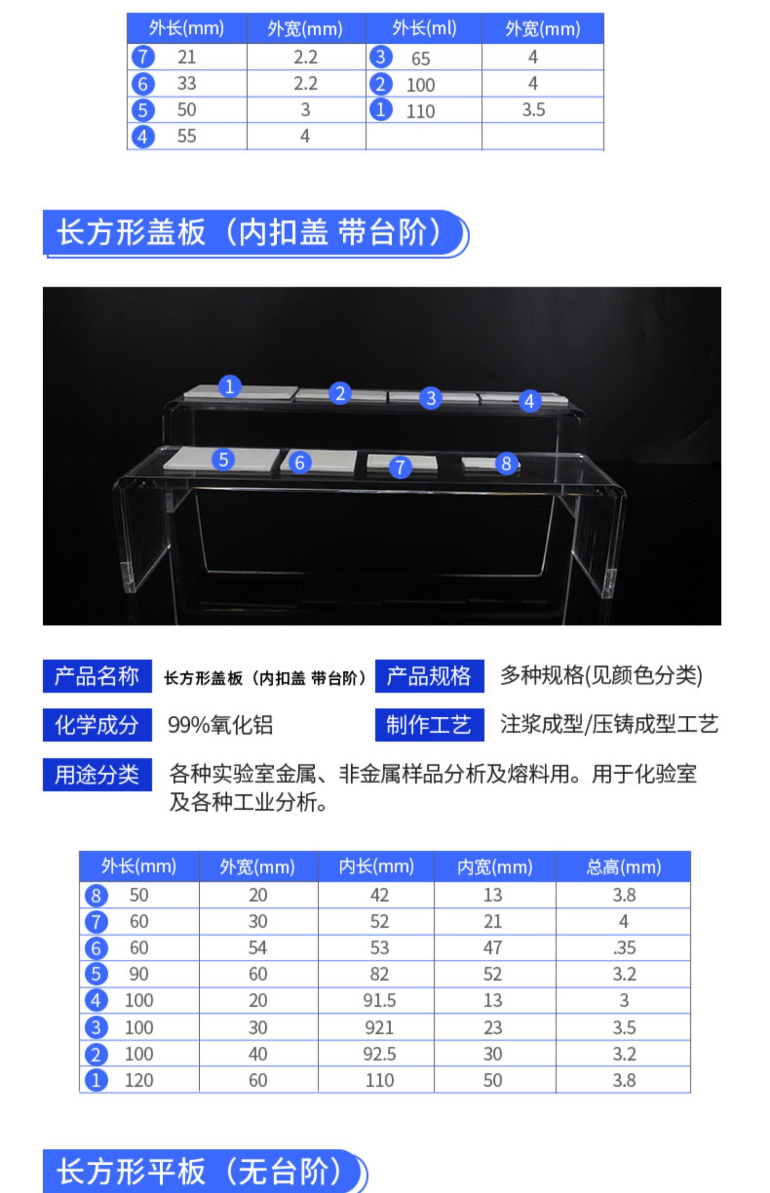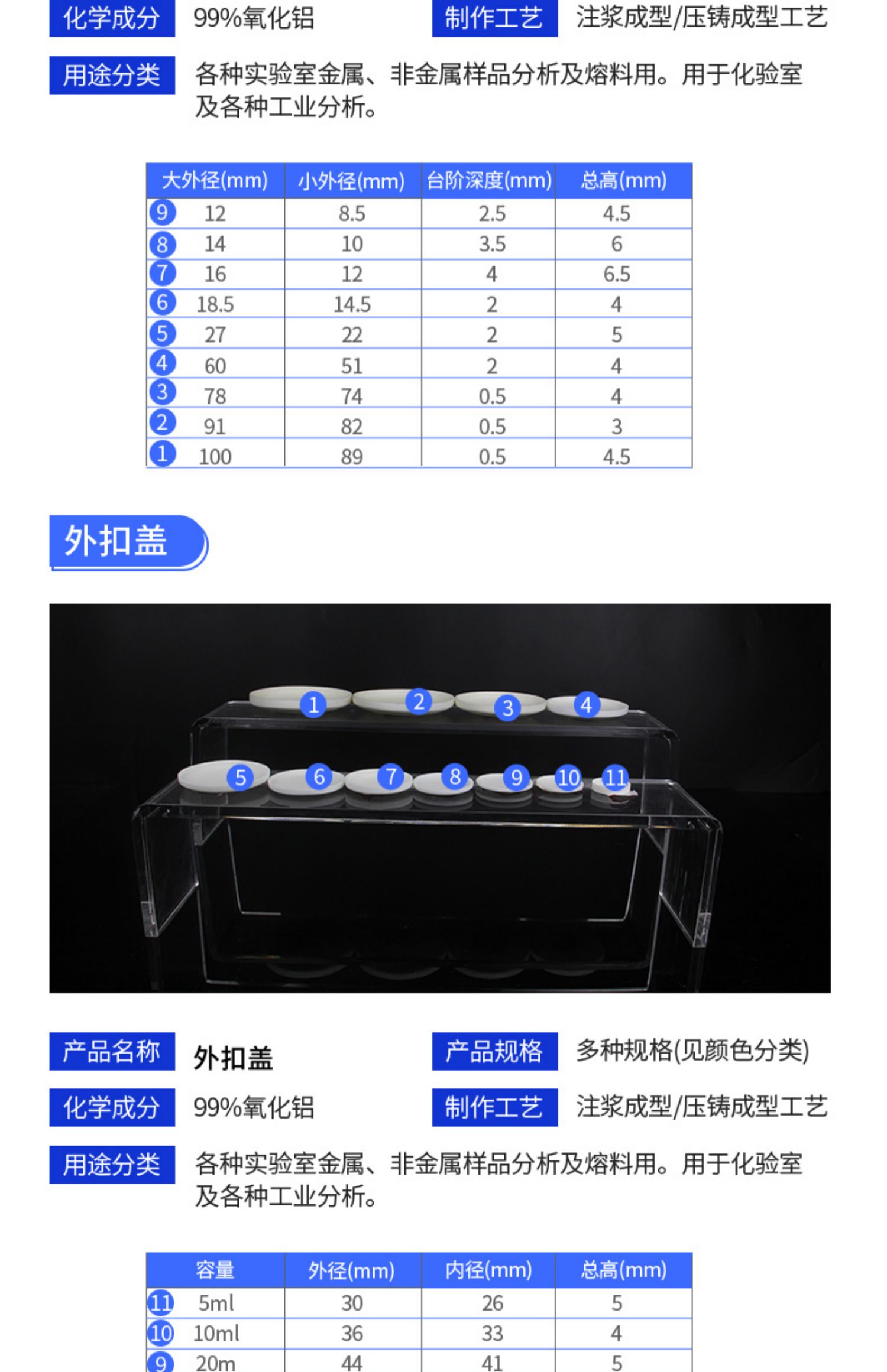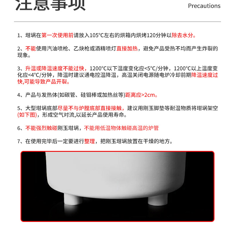 坩埚一般为瓷制品,规格有10、15、25、50mL等。种类有瓷坩埚、铁坩埚、氧化铝坩埚等。坩埚能耐高温,用来灼烧沉淀、熔化不与坩埚反应的盐类及使结晶水合物脱水等。坩埚用石灰、炭素及其他各种耐火土等为材料制成。坩埚可直接用火焰加热(用泥三角支撑),但需预热;实验中,坩埚必须用坩埚钳夹取,严禁用手接触热的坩埚,以免烫伤;为防止溅出固体或落入杂质,加热时应盖上盖,但当物质受热有大量气体或液体生成时,不可加盖。