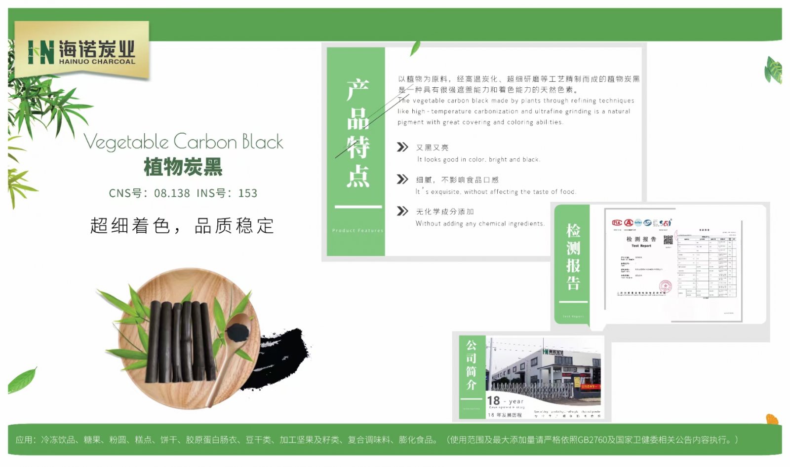 海诺食品添加剂--植物炭黑,是以大别山青竹为原料,经高温炭化,纳米级超细研磨精制而成。产品经国家产品质量监督检验院检测,10项理化指标全部优于国标GB28308,已批量出口欧盟。产品色泽好,又黑又亮;细腻,不影响食品口感;无任何化学成份添加。广泛应用于冷冻饮品(食用冰除外)、糖果、粉圆、糕点、饼干、胶原蛋白肠衣等。